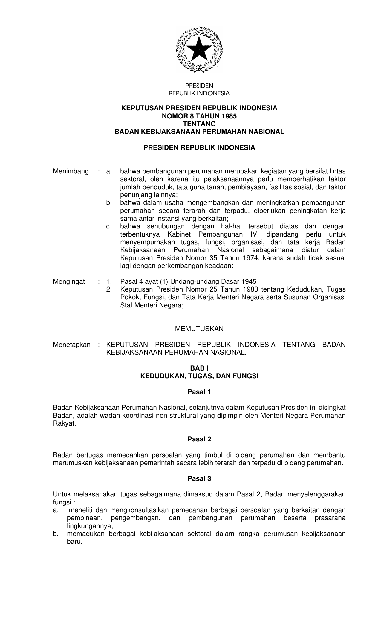 KEPPRES Nomor 8 Tahun 1985 | Keputusan Presiden Nomor 8 Tahun 1985 tentang BADAN KEBIJAKSANAAN PERUMAHAN NASIONAL