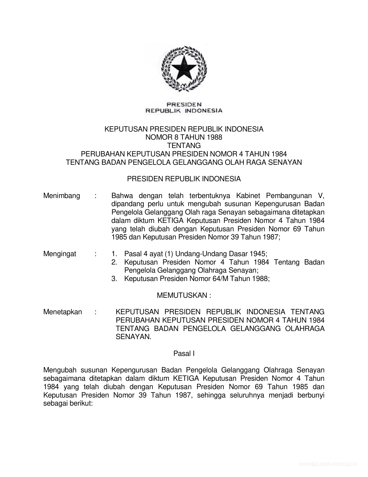 KEPPRES Nomor 8 Tahun 1988 | Keputusan Presiden Nomor 8 Tahun 1988 tentang PERUBAHAN KEPUTUSAN PRESIDEN NOMOR 4 TAHUN 1984 TENTANG BADAN PENGELOLA GELANGGANG OLAH RAGA SENAYAN
