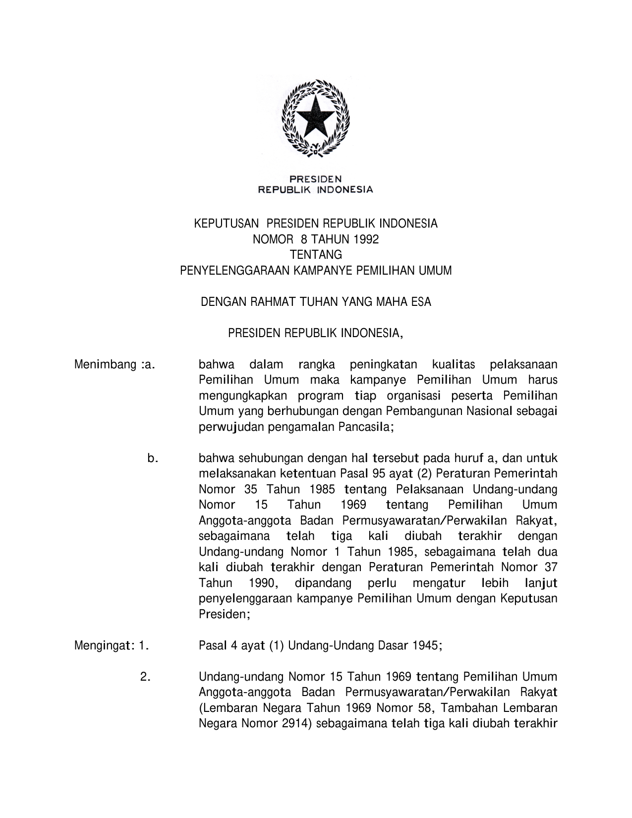 KEPPRES Nomor 8 Tahun 1992 | Keputusan Presiden Nomor 8 Tahun 1992 tentang PENYELENGGARAAN KAMPANYE PEMILIHAN UMUM