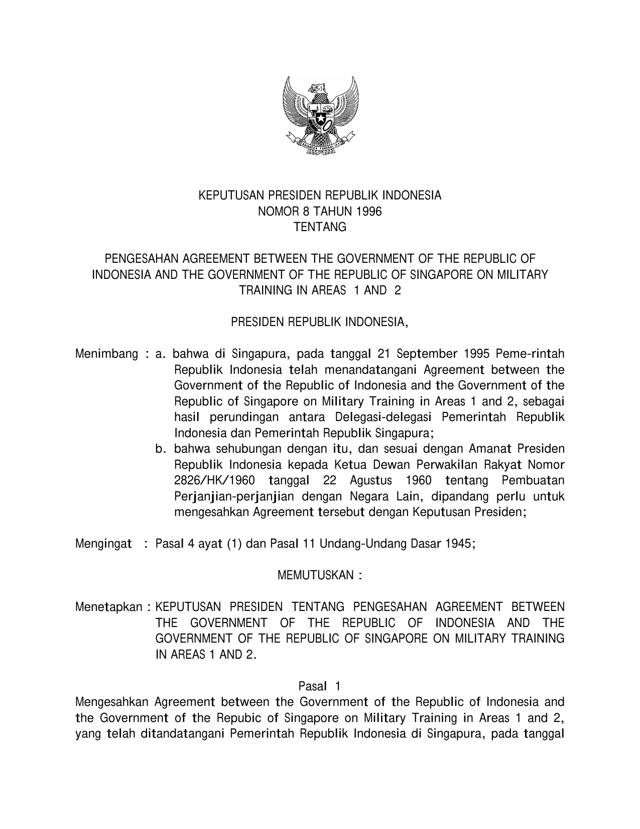 KEPPRES Nomor 8 Tahun 1996 | Keputusan Presiden Nomor 8 Tahun 1996 tentang PENGESAHAN AGREEMENT BETWEEN THE GOVERNMENT OF THE REPUBLIC OF INDONESIA AND THE GOVERNMENT OF THE REPUBLIC SINGAPORE ON MILITARY TRAINING IN AREAS 1 AND 2