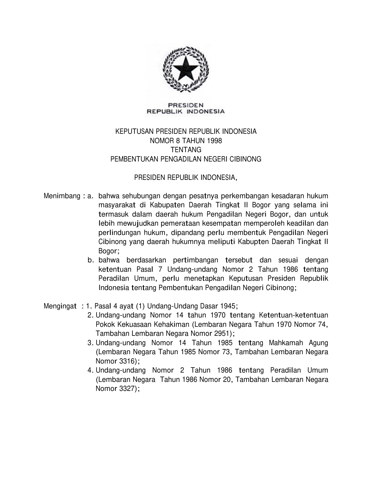 KEPPRES Nomor 8 Tahun 1998 | Keputusan Presiden Nomor 8 Tahun 1998 tentang PEMBENTUKAN PENGADILAN NEGERI CIBINONG