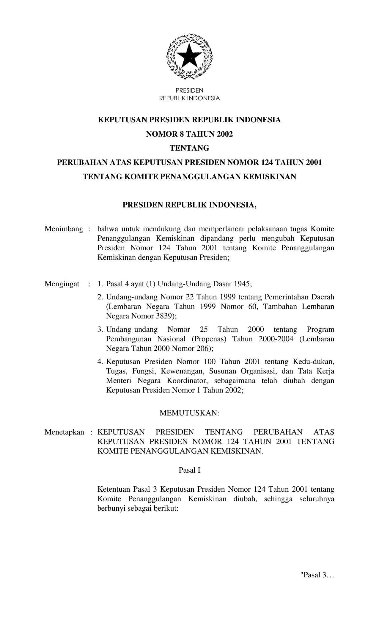 KEPPRES Nomor 8 Tahun 2002 | Keputusan Presiden Nomor 8 Tahun 2002 tentang PERUBAHAN KEPPRES 124-2001 TENTANG KOMITE PENANGGULANGAN KEMISKINAN