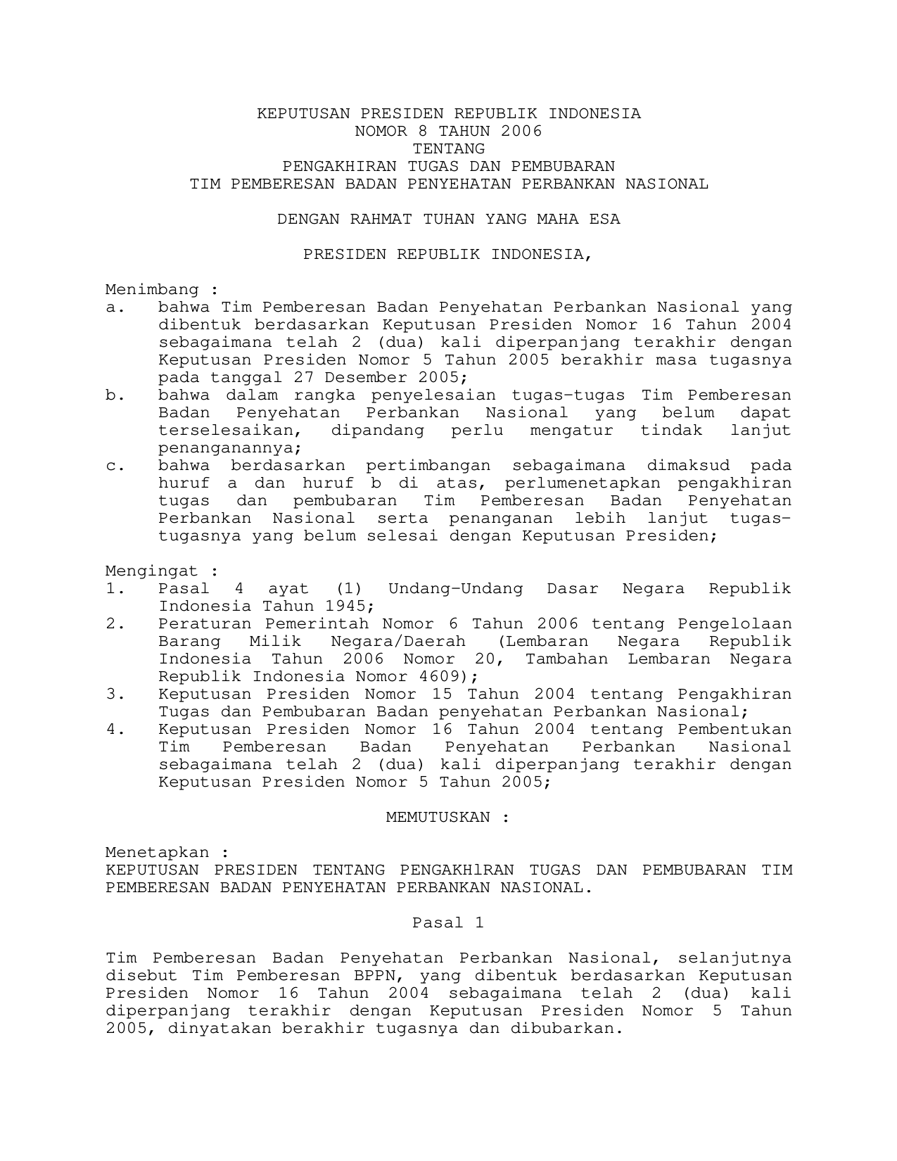 KEPPRES Nomor 8 Tahun 2006 | Keputusan Presiden Nomor 8 Tahun 2006 tentang PENGAKHIRAN TUGAS DAN PEMBUBARAN TIM PEMBERESAN BADAN PENYEHATAN PERBANKAN NASIONAL