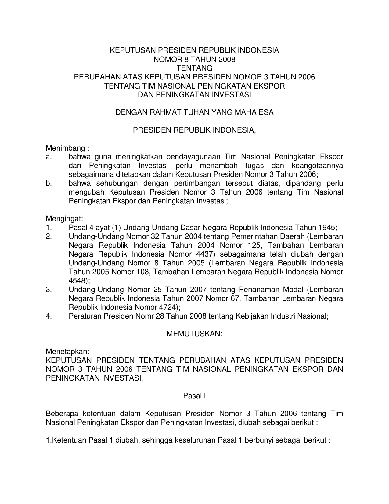 KEPPRES Nomor 8 Tahun 2008 | Keputusan Presiden Nomor 8 Tahun 2008 tentang PERUBAHAN KEPPRES 3-2006 TENTANG TIM NASIONAL PENINGKATAN EKSPOR DAN PENINGKATAN INVESTASI