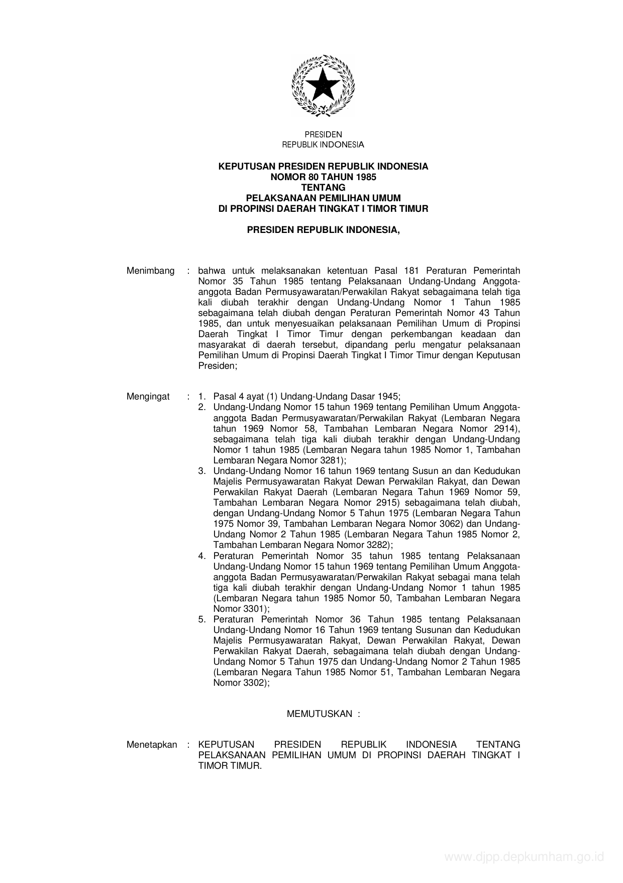 KEPPRES Nomor 80 Tahun 1985 | Keputusan Presiden Nomor 80 Tahun 1985 tentang PELAKSANAAN PEMILIHAM UMUM DI PROPINSI DAERAH TINGKAT I TIMOR TIMUR