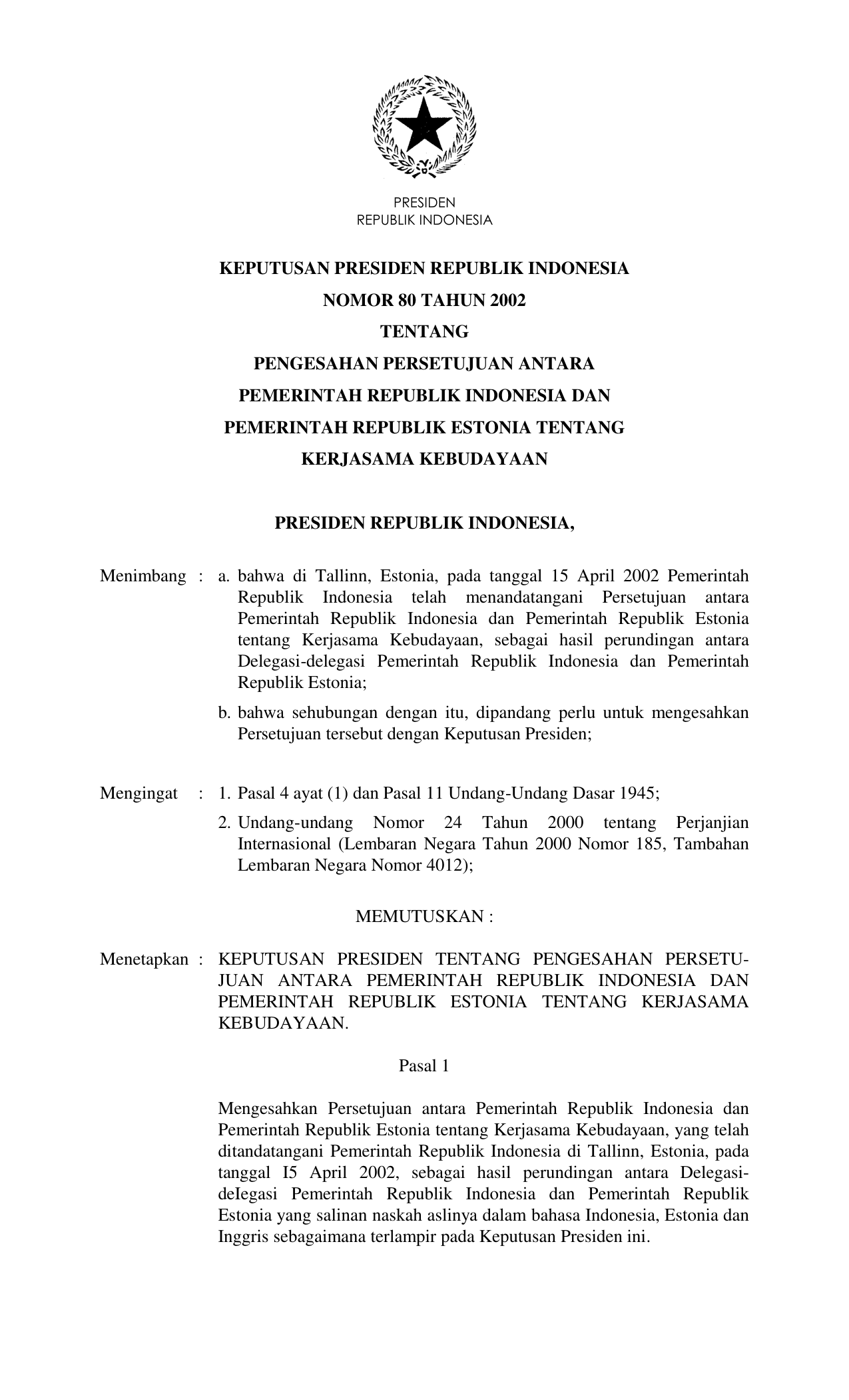 KEPPRES Nomor 80 Tahun 2002 | Keputusan Presiden Nomor 80 Tahun 2002 tentang PENGESAHAN PERSETUJUAN ANTARA PEMERINTAH RI DAN PEMERINTAH REPUBLIK ESTONIA TENTANG KERJASAMA KEBUDAYAAN