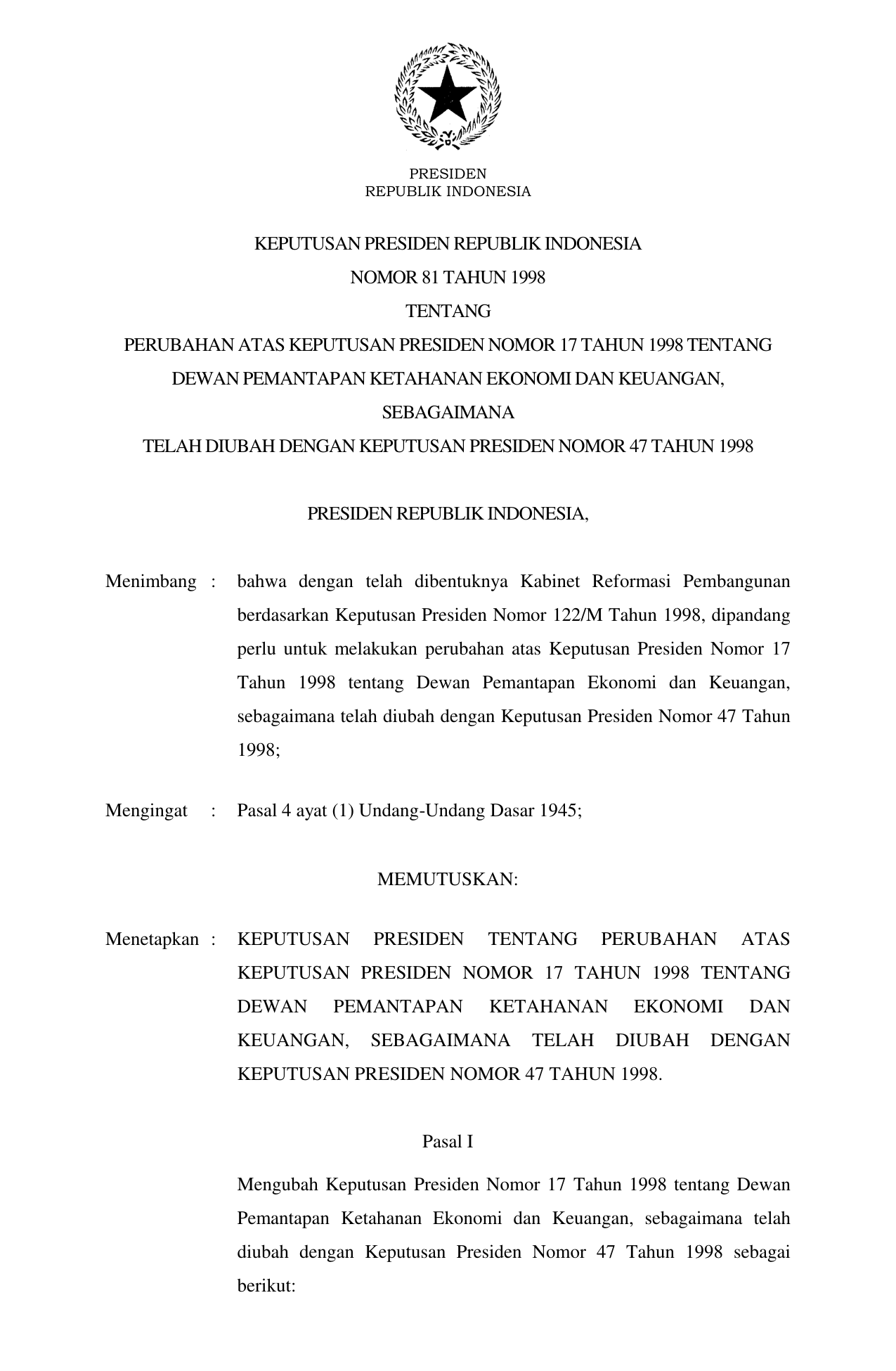 KEPPRES Nomor 81 Tahun 1998 | Keputusan Presiden Nomor 81 Tahun 1998 tentang PERUBAHAN ATAS KEPUTUSAN PRESIDEN NOMOR 17 TAHUN 1998 TENTANG DEWAN PEMANTAPAN KETAHANAN EKONOMI DAN KEUANGAN, SEBAGAIMANA TELAH DIUBAH DENGAN KEPUTUSAN PRESIDEN NOMOR 47 TAHUN 1998