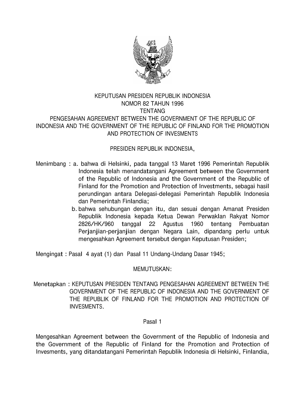 KEPPRES Nomor 82 Tahun 1996 | Keputusan Presiden Nomor 82 Tahun 1996 tentang PENGESAHAN AGREEMENT BETWEEN THE GOVERNMENT OF THE REPUBLIC OF INDONESIA AND GOVERNMENT OF THE REPUBLIC OF FINLAND FOR THE PROMOTION AND PROTECTION OF INVESTMENT