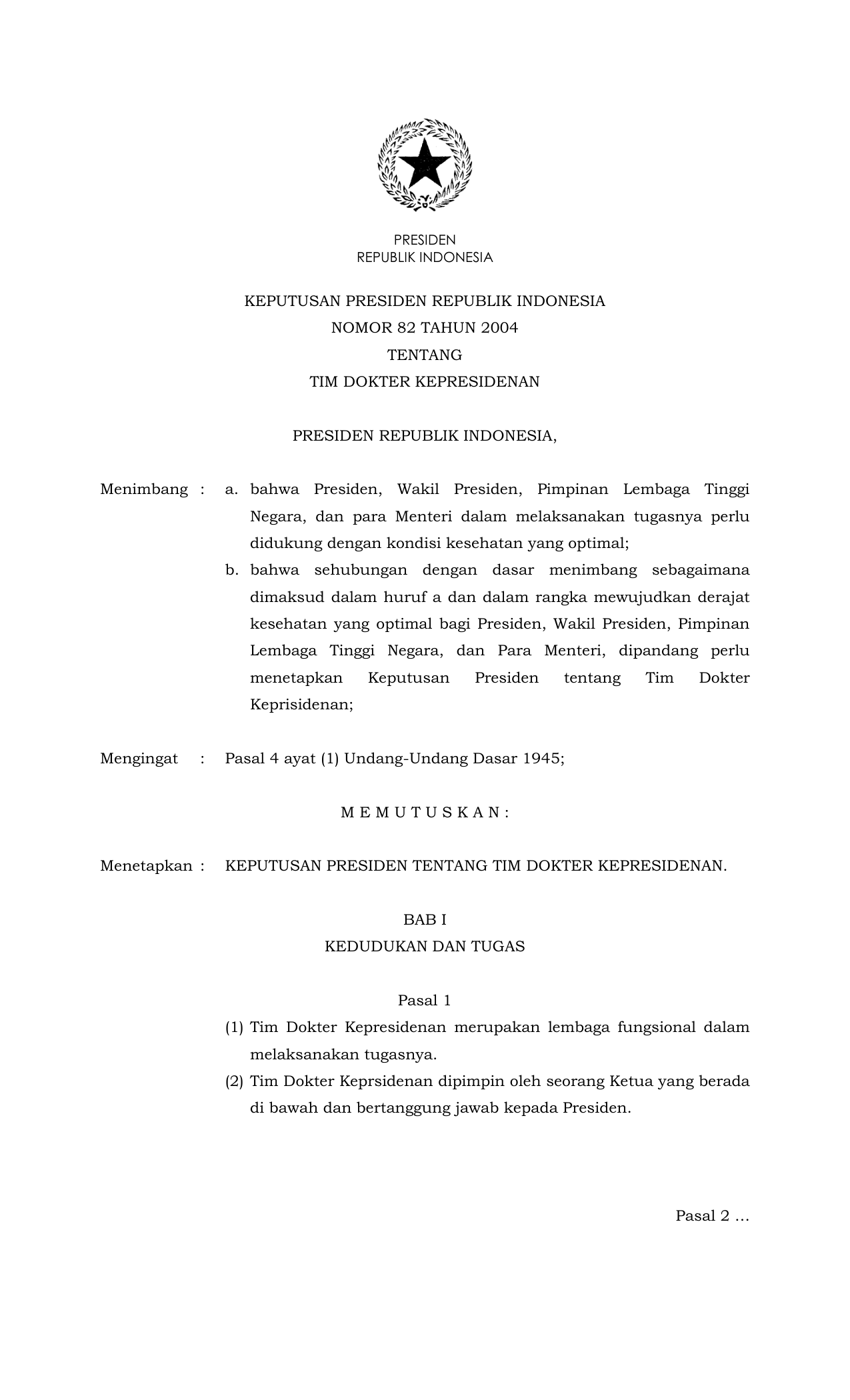 KEPPRES Nomor 82 Tahun 2004 | Keputusan Presiden Nomor 82 Tahun 2004 tentang TIM DOKTER KEPRESIDENAN