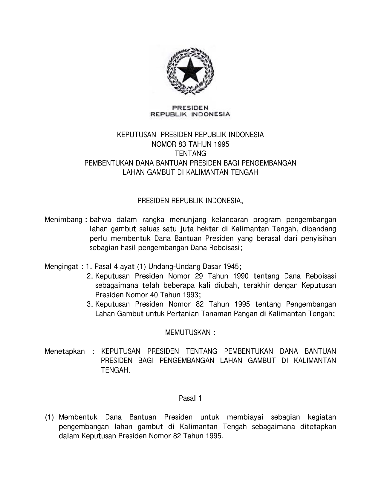 KEPPRES Nomor 83 Tahun 1995 | Keputusan Presiden Nomor 83 Tahun 1995 tentang PEMBENTUKAN DANA BANTUAN PRESIDEN BAGI PENGEMBANGAN LAHAN GAMBUT DI KALIMANTAN TENGAH