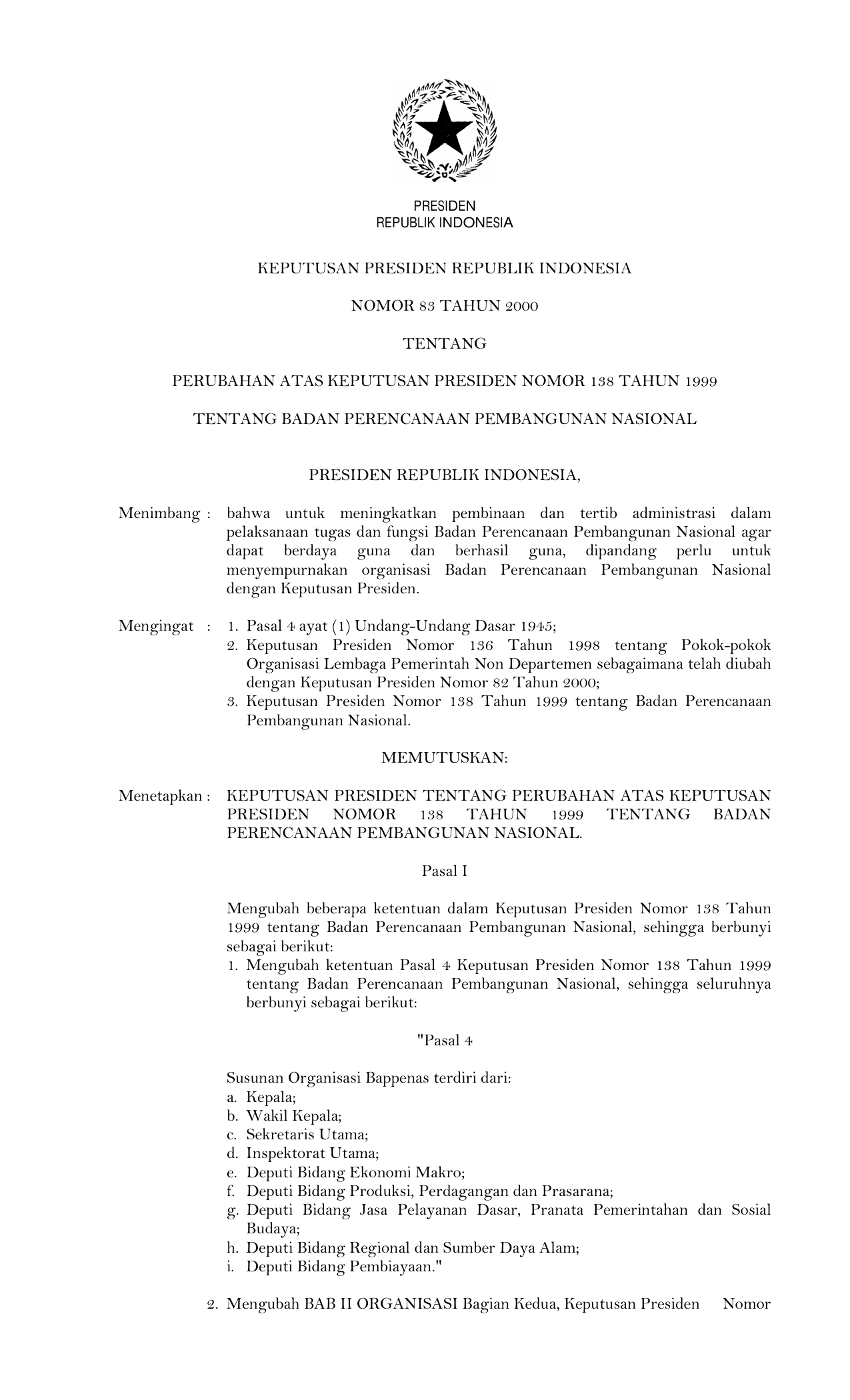 KEPPRES Nomor 83 Tahun 2000 | Keputusan Presiden Nomor 83 Tahun 2000 tentang PERUBAHAN KEPPRES 138-1999 TENTANG BADAN PERENCANAAN PEMBANGUNAN NASIONAL