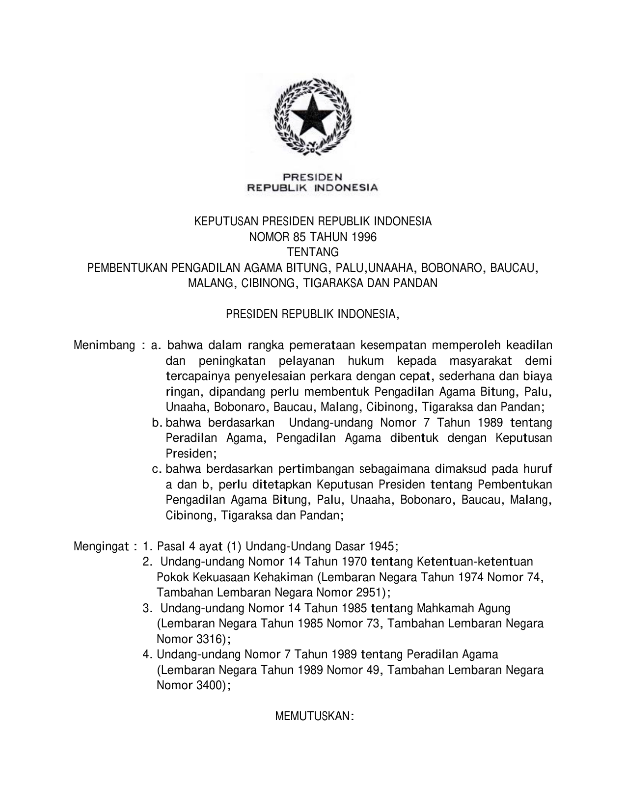 KEPPRES Nomor 85 Tahun 1996 | Keputusan Presiden Nomor 85 Tahun 1996 tentang PEMBENTUKAN PENGADILAN AGAMA BITUNG, PALU, UNAAHA, BOBONARO, BAUCAU, MALANG, CIBINONG, TIGARAKSA, DAN PANDAN
