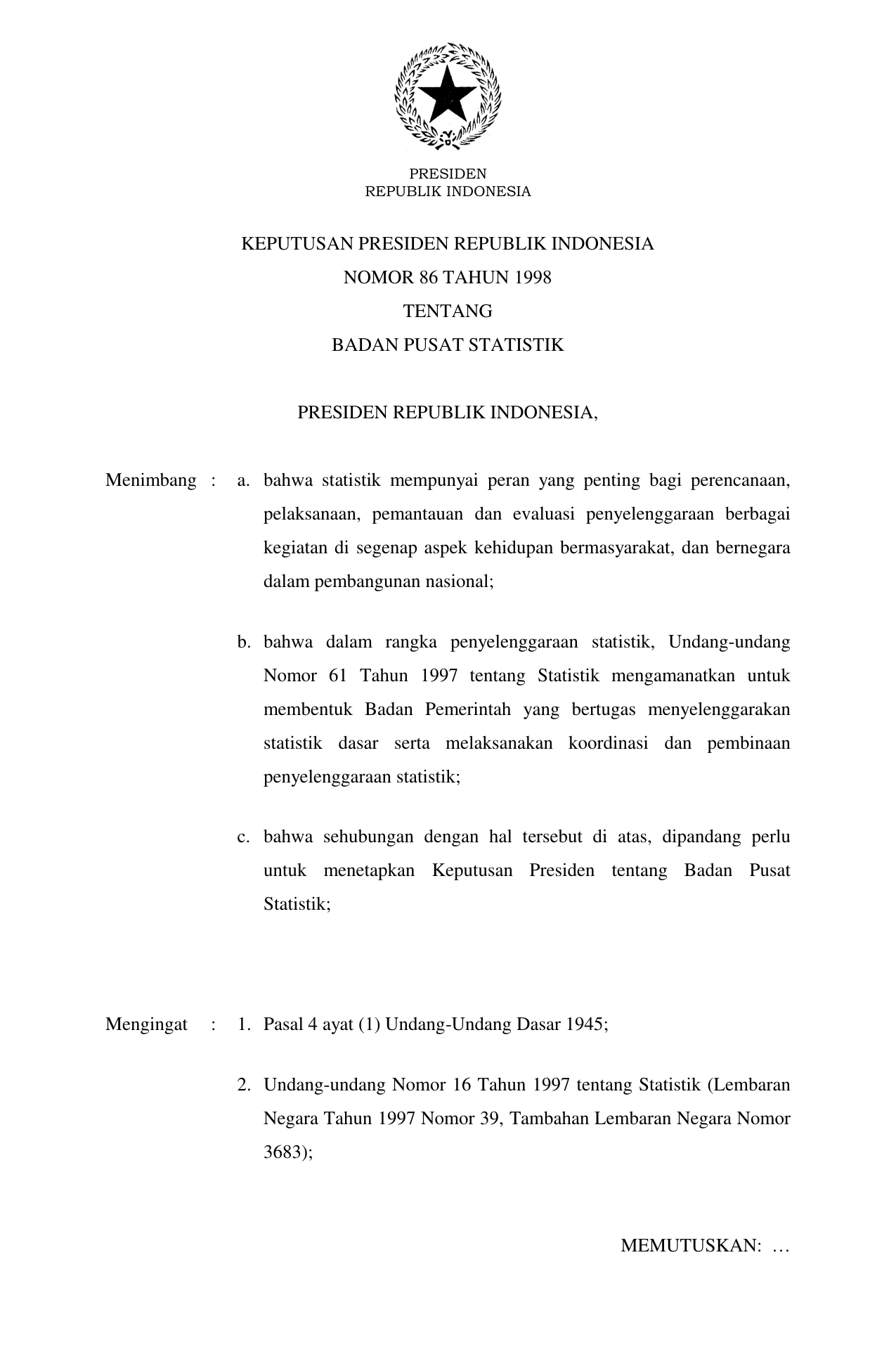 KEPPRES Nomor 86 Tahun 1998 | Keputusan Presiden Nomor 86 Tahun 1998 tentang BADAN PUSAT STATISTIK