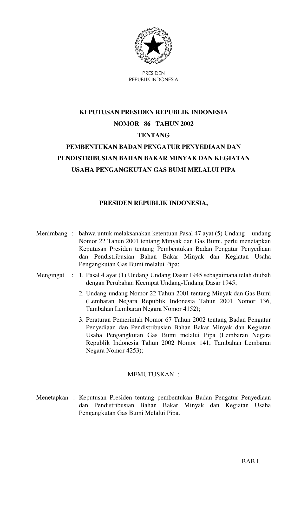 KEPPRES Nomor 86 Tahun 2002 | Keputusan Presiden Nomor 86 Tahun 2002 tentang PEMBENTUKAN BADAN PENGATUR PENYEDIAAN DAN PENDISTRIBUSIAN BAHAN BAKAR MINYAK DAN KEGIATAN USAHA PENGANGKUTAN GAS BUMI MELALUI PIPA