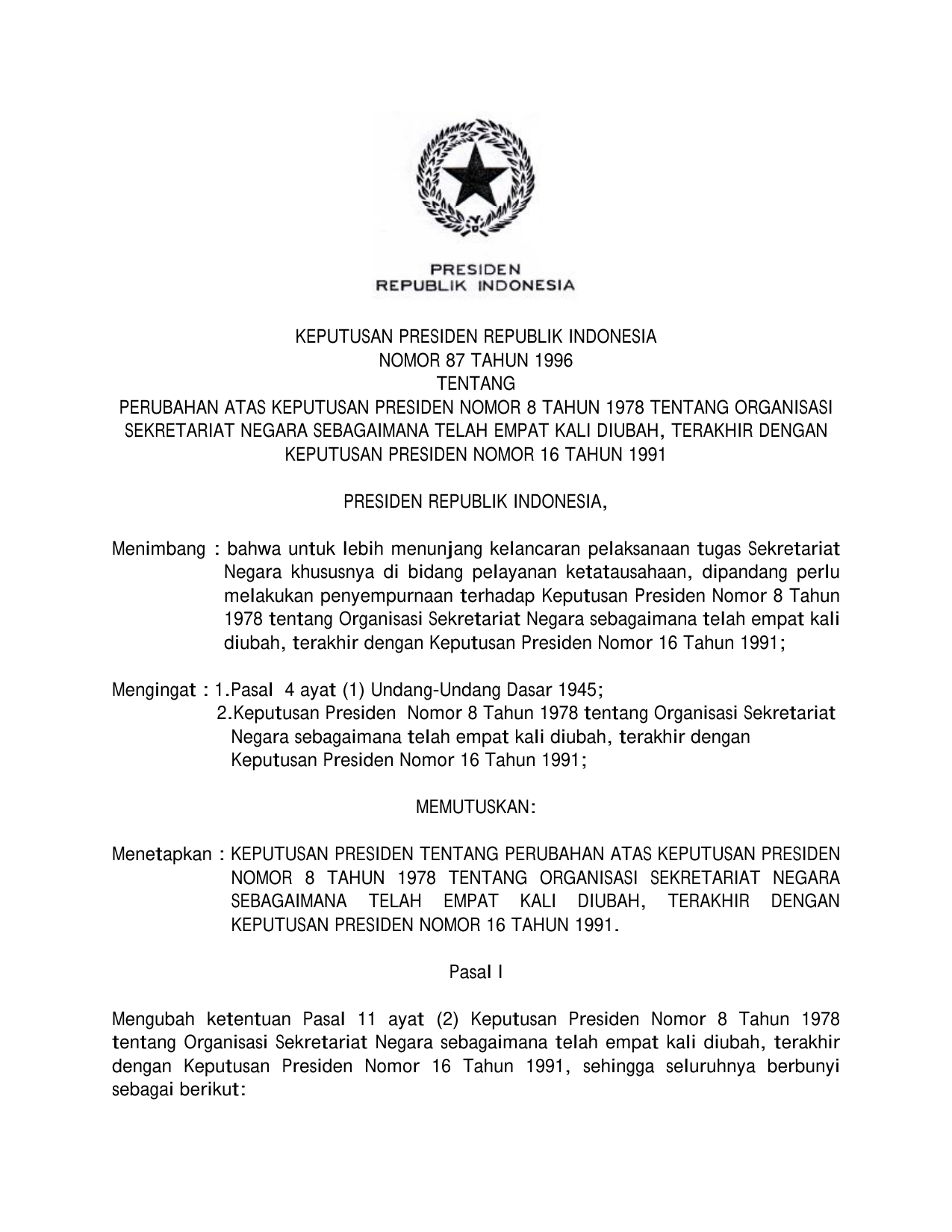 KEPPRES Nomor 87 Tahun 1996 | Keputusan Presiden Nomor 87 Tahun 1996 tentang PERUBAHAN KEPPRES 8-1978 TENTANG ORGANISASI SEKRETARIAT NEGARA SEBAGAIMANA TELAH EMPAT KALI DIUBAH TERAKHIR DENGAN KEPPRES 16-1991