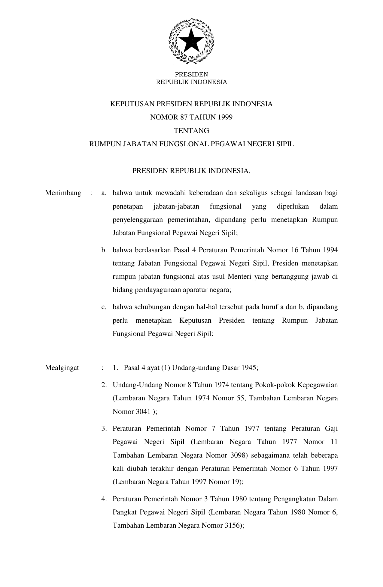 KEPPRES Nomor 87 Tahun 1999 | Keputusan Presiden Nomor 87 Tahun 1999 tentang RUMPUN JABATAN FUNGSIONAL PEGAWAI NEGERI SIPIL