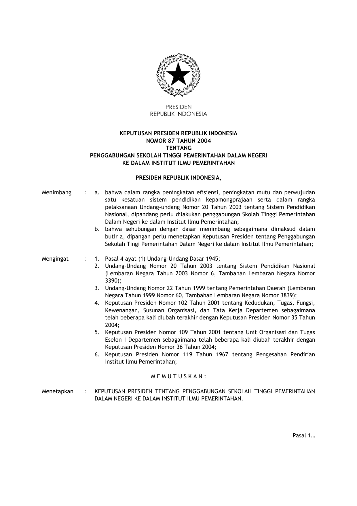 KEPPRES Nomor 87 Tahun 2004 | Keputusan Presiden Nomor 87 Tahun 2004 tentang PENGGABUNGAN SEKOLAH TINGGI PEMERINTAHAN DALAM NEGERI KE DALAM INSTITUT ILMU PEMERINTAHAN