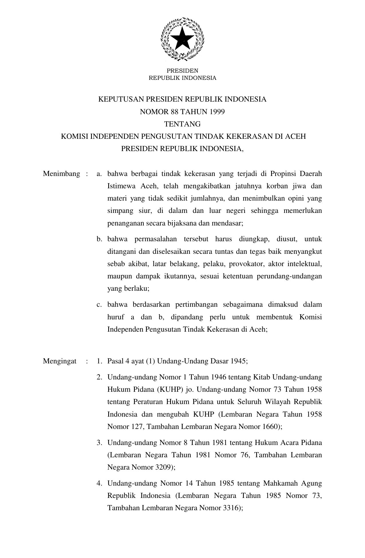 KEPPRES Nomor 88 Tahun 1999 | Keputusan Presiden Nomor 88 Tahun 1999 tentang KOMISI INDEPENDEN PENGUSUTAN TINDAK KEKERASAN DI ACEH