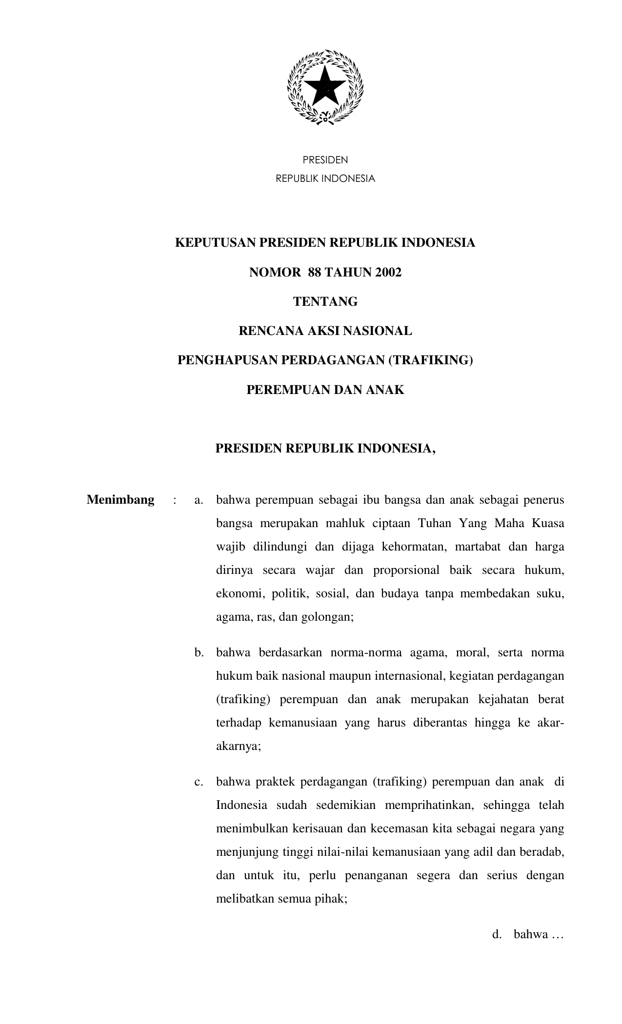 KEPPRES Nomor 88 Tahun 2002 | Keputusan Presiden Nomor 88 Tahun 2002 tentang RENCANA AKSI NASIONAL PENGHAPUSAN PERDAGANGAN (TRAFIKING) PEREMPUAN DAN ANAK