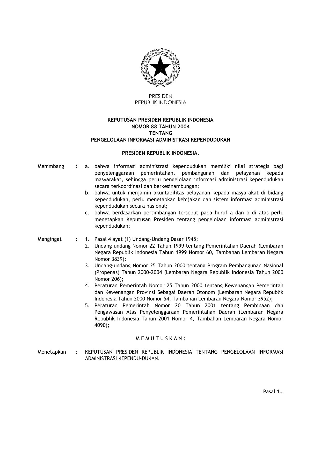 KEPPRES Nomor 88 Tahun 2004 | Keputusan Presiden Nomor 88 Tahun 2004 tentang PENGELOLAAN INFORMASI ADMINISTRASI KEPENDUDUKAN