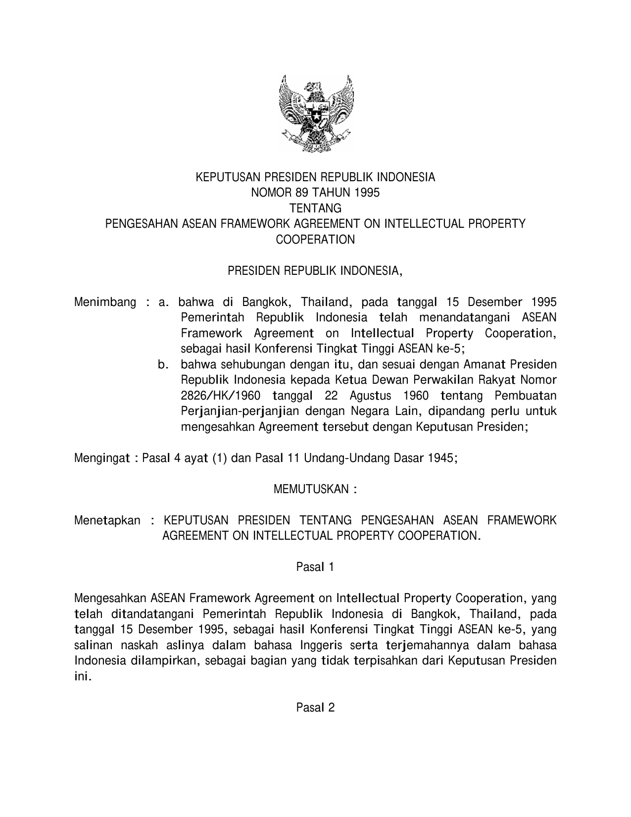 KEPPRES Nomor 89 Tahun 1995 | Keputusan Presiden Nomor 89 Tahun 1995 tentang PENGESAHAN ASEAN FRAMEWORK AGREEMENT ON INTELECTUAL PROPERTY COOPERATION