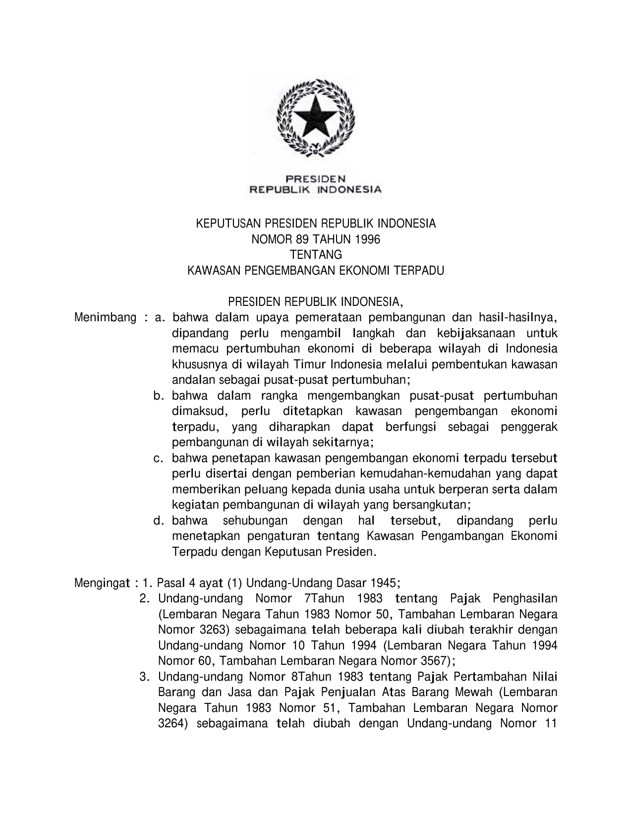 KEPPRES Nomor 89 Tahun 1996 | Keputusan Presiden Nomor 89 Tahun 1996 tentang KAWASAN PENGEMBANGAN EKONOMI TERPADU