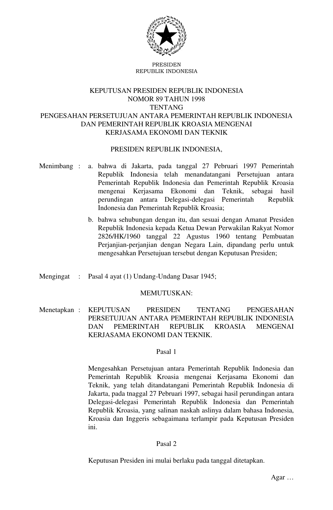 KEPPRES Nomor 89 Tahun 1998 | Keputusan Presiden Nomor 89 Tahun 1998 tentang PENGESAHAN PERSETUJUAN ANTARA PEMERINTAH REPUBLIK INDONESIA DAN PEMERINTAH REPUBLIK KROASIA MENGENAI KERJASAMA EKONOMI DAN TEKNIK