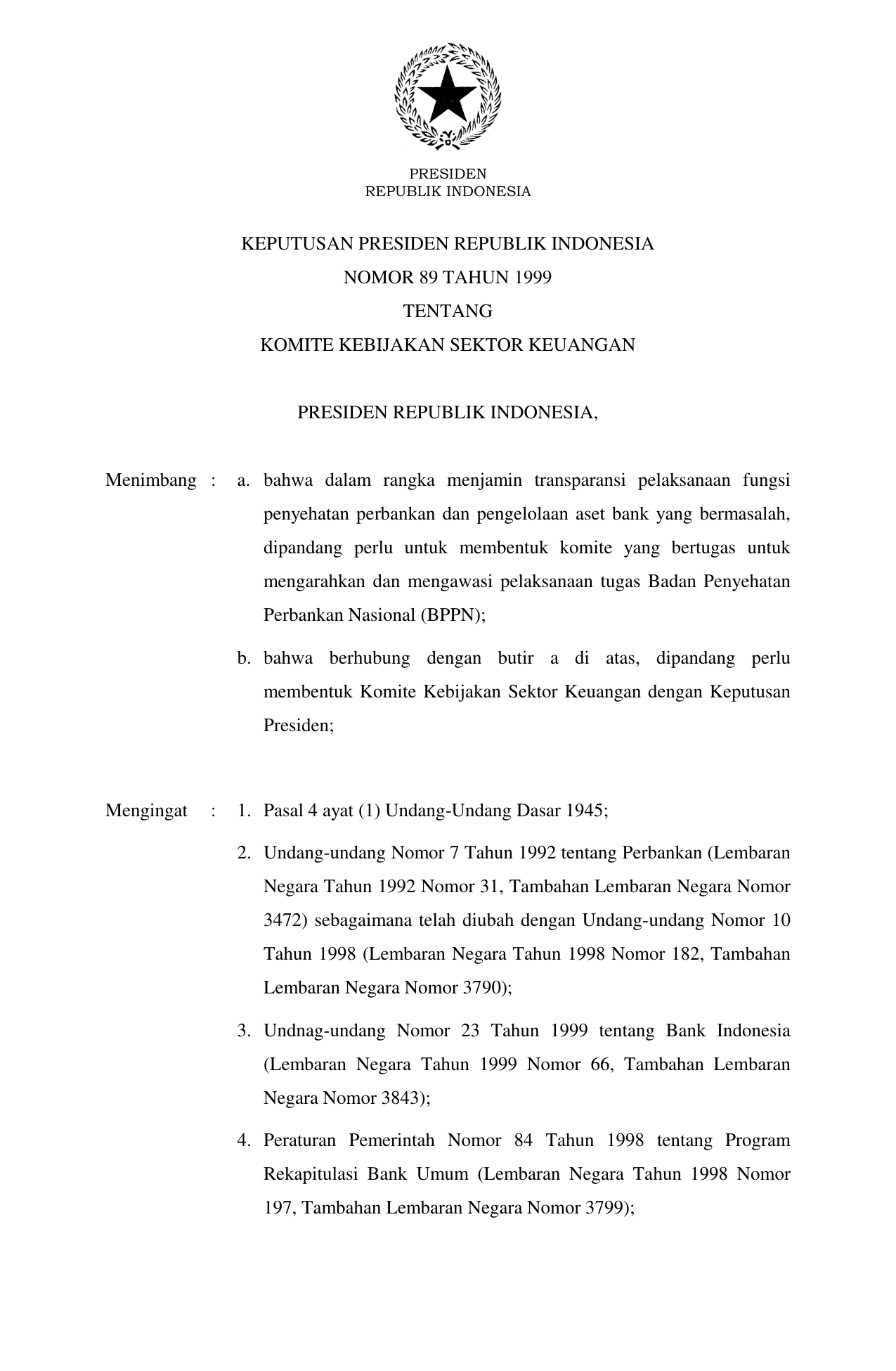KEPPRES Nomor 89 Tahun 1999 | Keputusan Presiden Nomor 89 Tahun 1999 tentang KOMITE KEBIJAKAN SEKTOR KEUANGAN