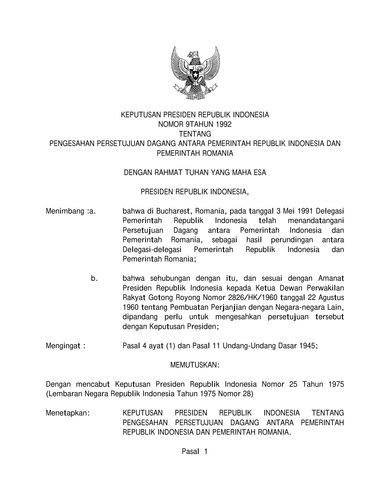 KEPPRES Nomor 9 Tahun 1992 | Keputusan Presiden Nomor 9 Tahun 1992 tentang PENGESAHAN PERSETUJUAN DAGANG ANTARA PEMERINTAH REPUBLIK INDONASIA DENGAN PEMERINTAH ROMANIA