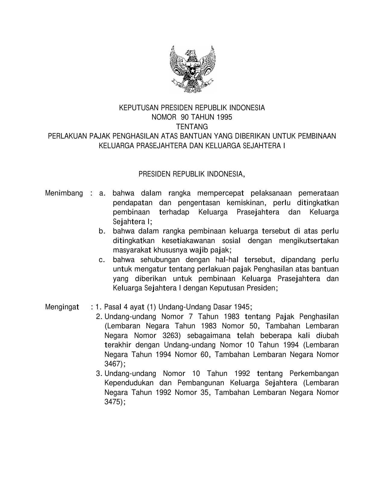 KEPPRES Nomor 90 Tahun 1995 | Keputusan Presiden Nomor 90 Tahun 1995 tentang PERLAKUAN PAJAK PENGHASILAN ATAS BANTUAN YANG DIBERIKAN UNTUK PEMBINAAN KELUARGA PRASEJAHTERA DAN KELUARGA SEJAHTERA I