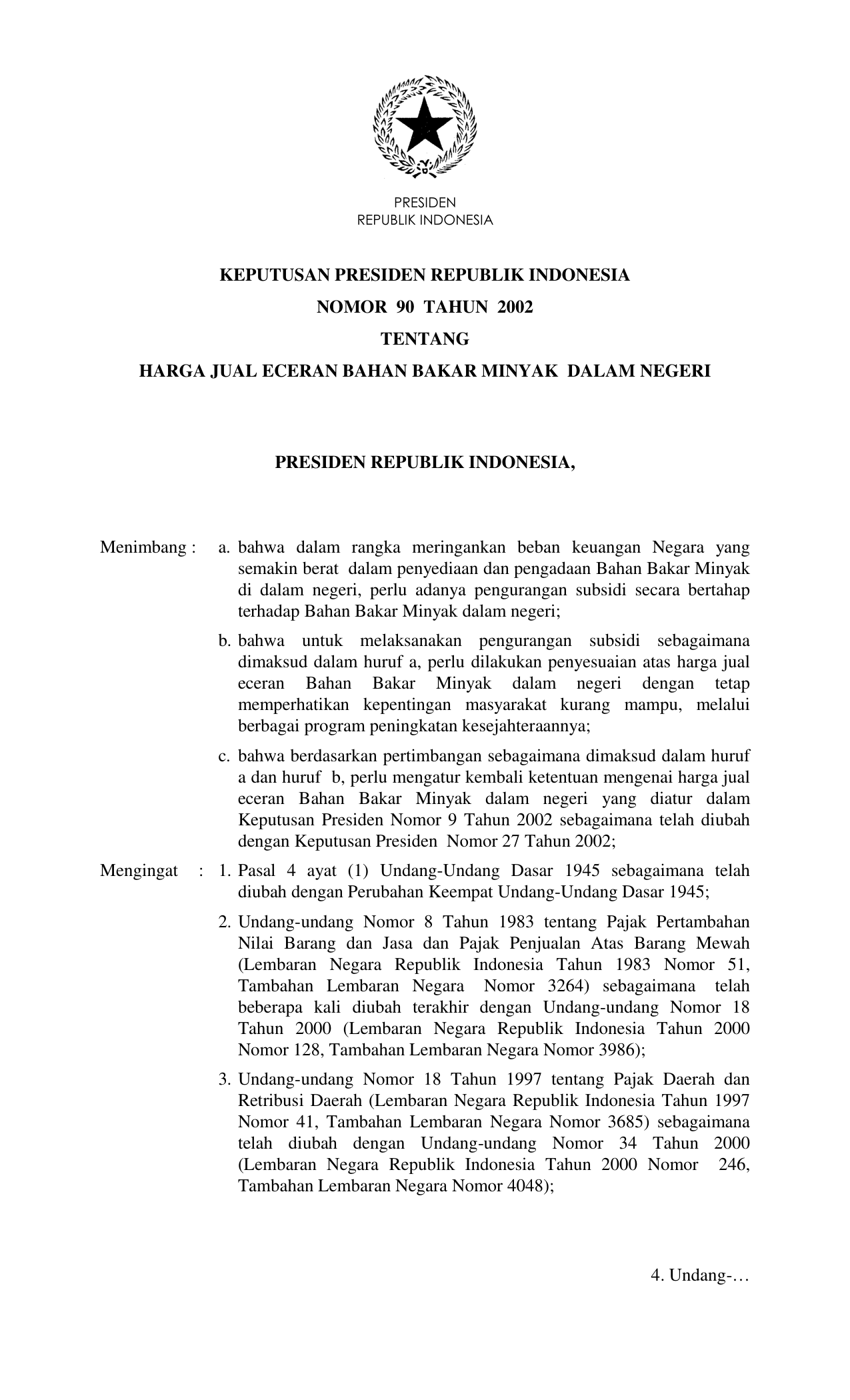 KEPPRES Nomor 90 Tahun 2002 | Keputusan Presiden Nomor 90 Tahun 2002 tentang HARGA JUAL ECERAN BAHAN BAKAR MINYAK DALAM NEGERI
