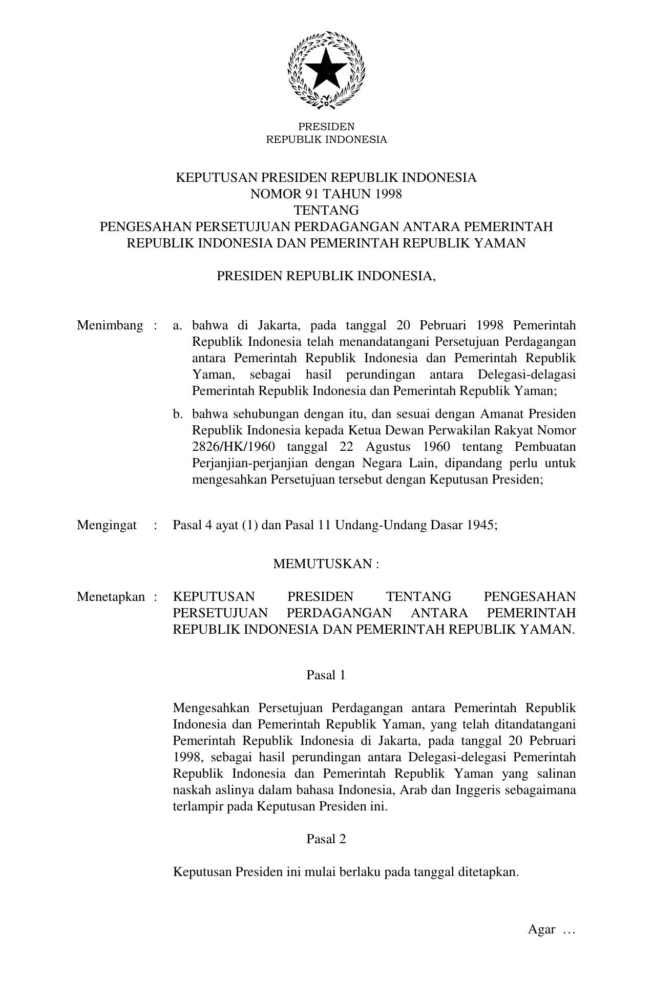 KEPPRES Nomor 91 Tahun 1998 | Keputusan Presiden Nomor 91 Tahun 1998 tentang PENGESAHAN PERSETUJUAN PERDAGANGAN ANTARA PEMERINTAH REPUBLIK INDONESIA DAN PEMERINTAH REPUBLIK YAMAN