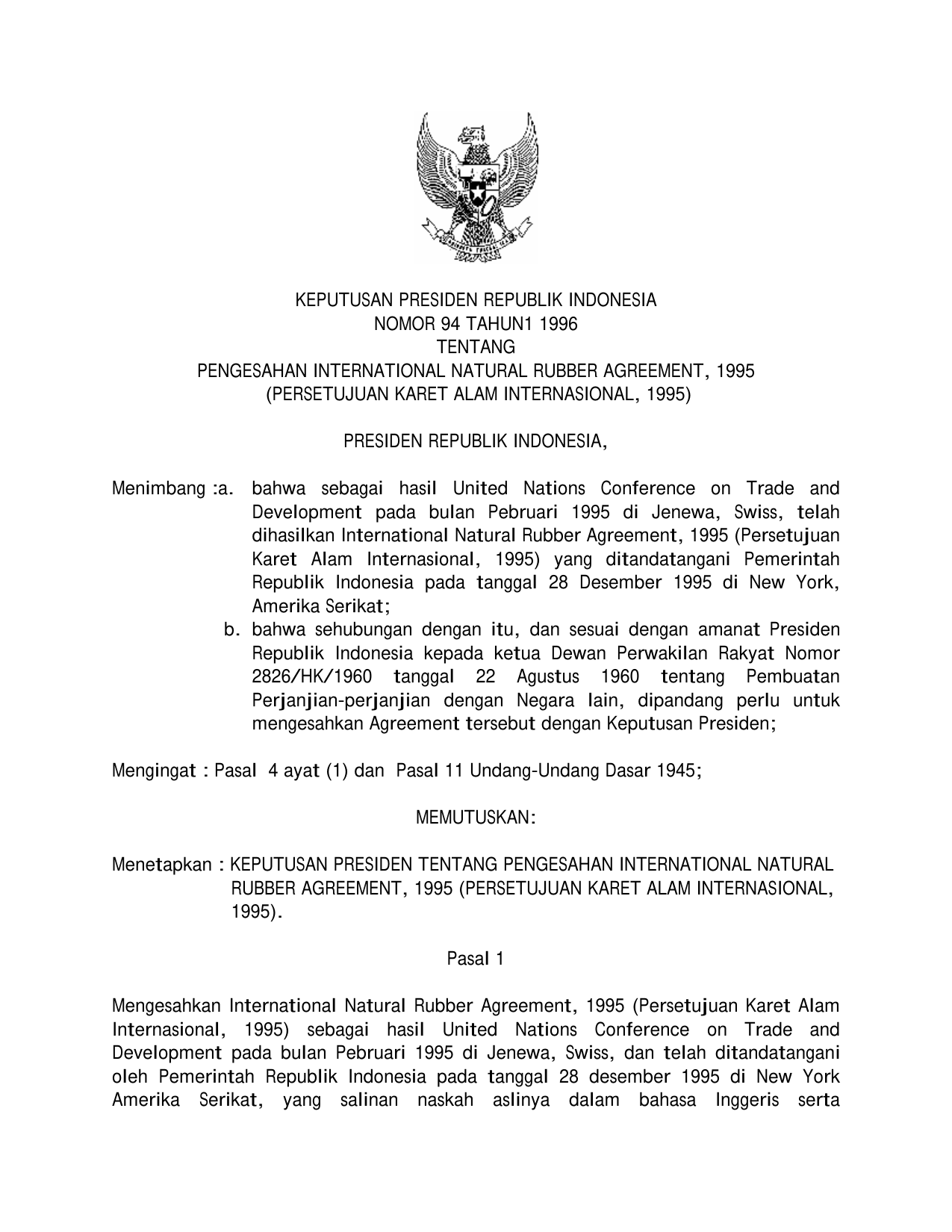KEPPRES Nomor 94 Tahun 1996 | Keputusan Presiden Nomor 94 Tahun 1996 tentang PENGESAHAN INTERNATIONAL NATURAL RUBBER AGREEMENT, 1995 (PERSETUJUAN KARET ALAM INTERNASIONAL, 1995)