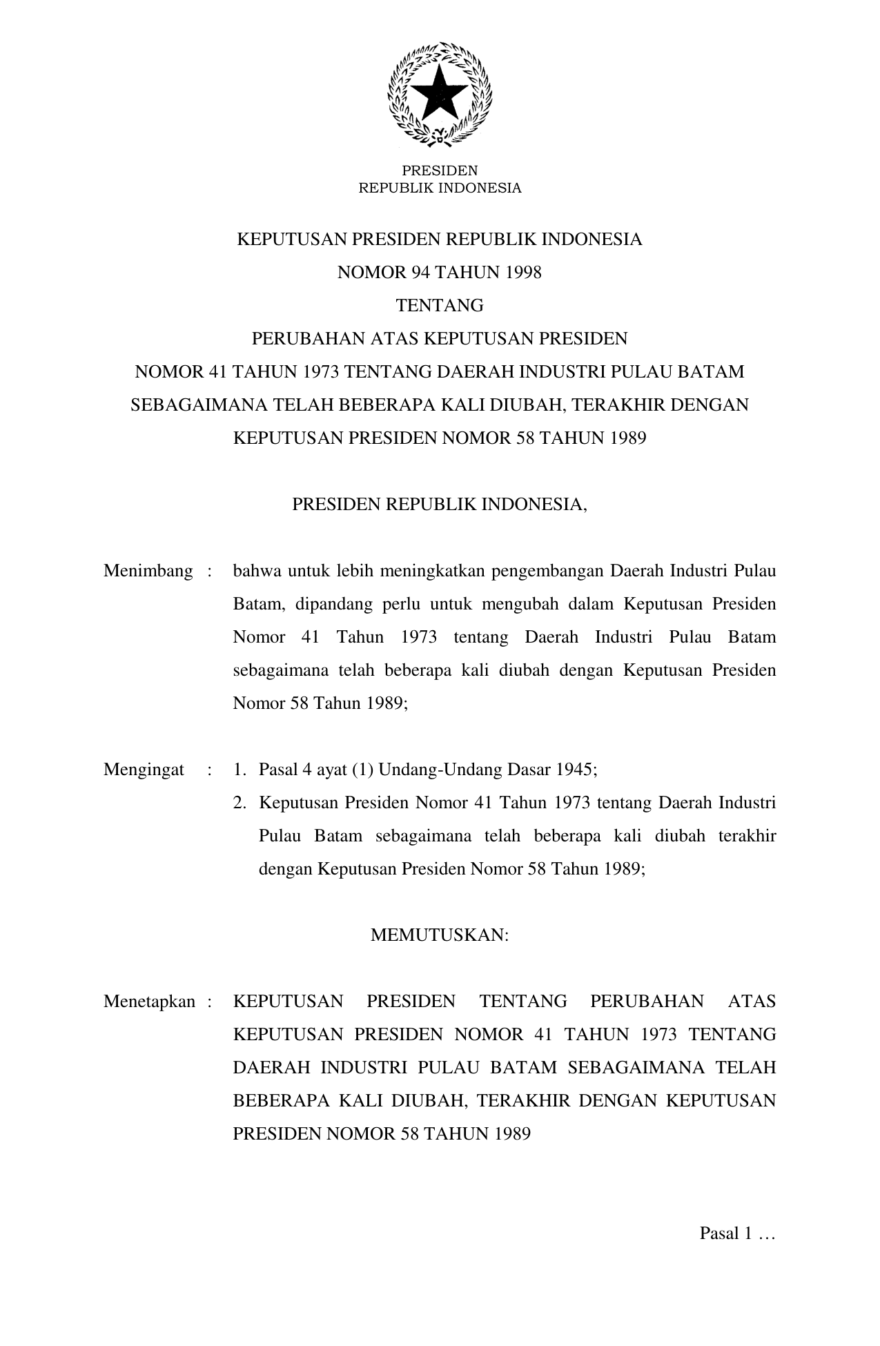 KEPPRES Nomor 94 Tahun 1998 | Keputusan Presiden Nomor 94 Tahun 1998 tentang PERUBAHAN ATAS KEPUTUSAN PRESIDEN NOMOR 41 TAHUN 1973 TENTANG DAERAH INDUSTRI PULAU BATAM SEBAGAIMANA TELAH BEBERAPA KALI DIUBAH, TERAKHIR DENGAN KEPUTUSAN PRESIDEN NOMOR 58 TAHUN 1989