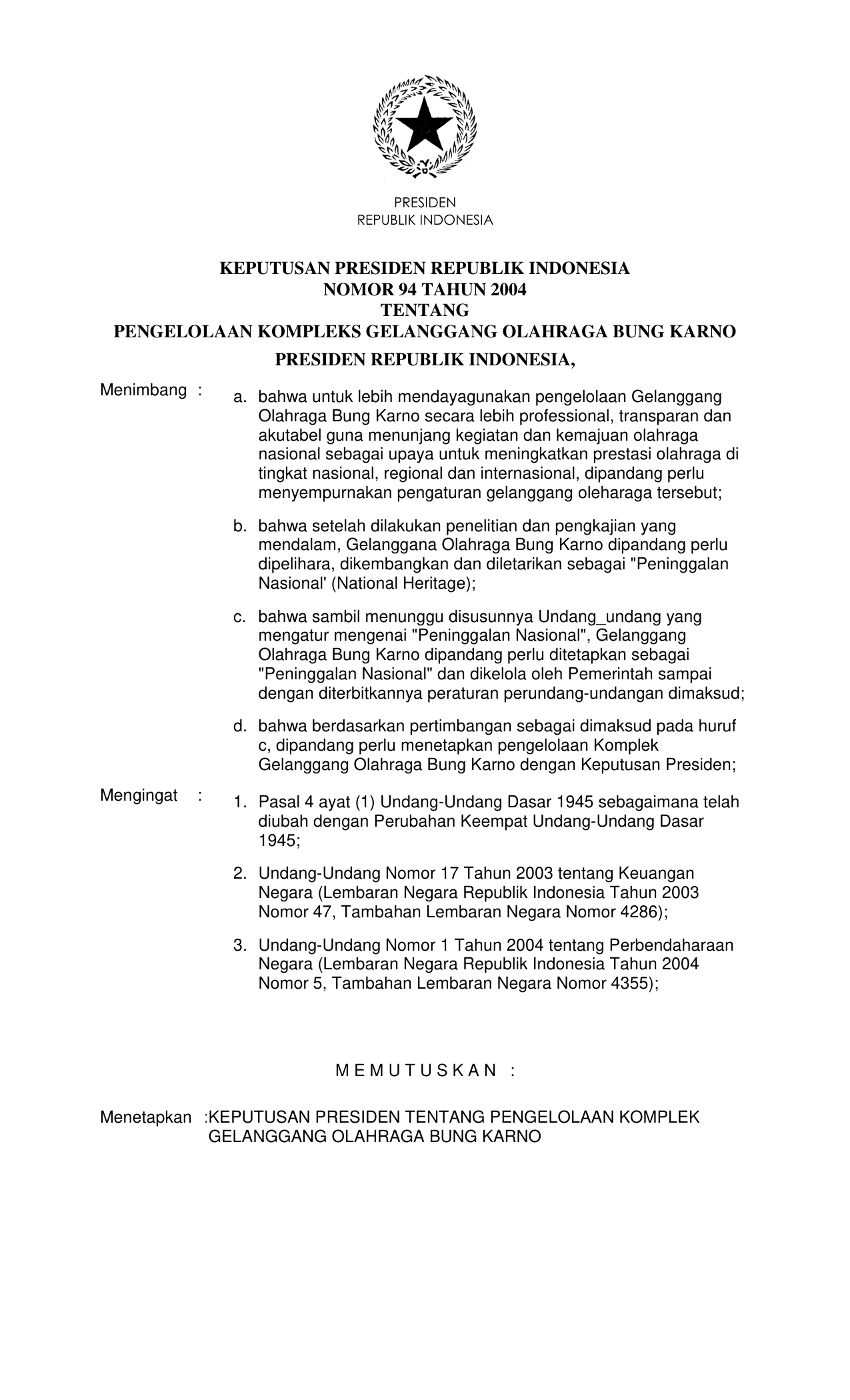 KEPPRES Nomor 94 Tahun 2004 | Keputusan Presiden Nomor 94 Tahun 2004 tentang PENGELOLAAN KOMPLEK GELANGGANG OLAHRAGA BUNG KARNO