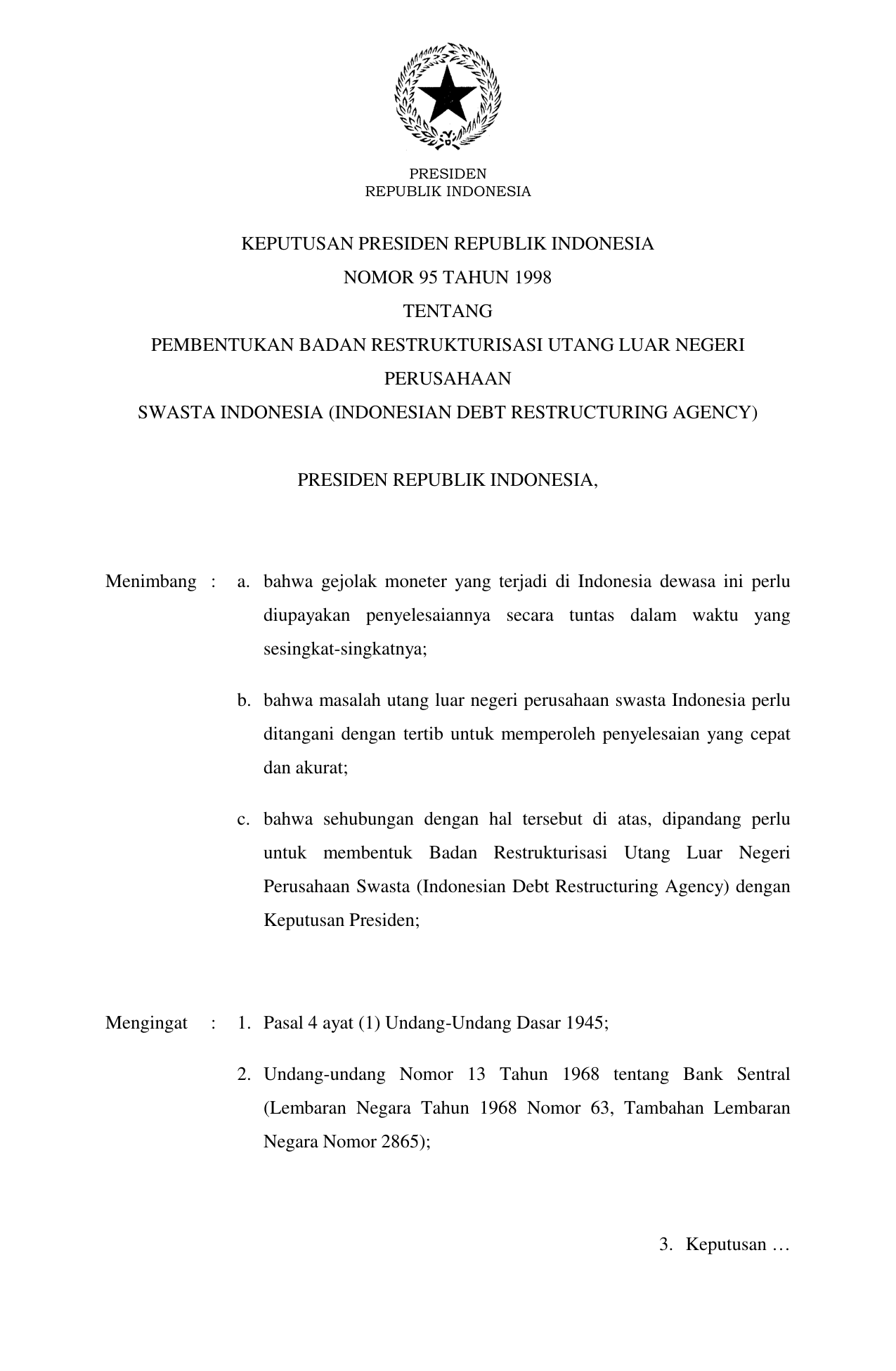 KEPPRES Nomor 95 Tahun 1998 | Keputusan Presiden Nomor 95 Tahun 1998 tentang PEMBENTUKAN BADAN RESTRUKTURISASI UTANG LUAR NEGERI PERUSAHAAN SWASTA INDONESIA (INDONESIAN DEBT RESTRUCTURING AGENCY)