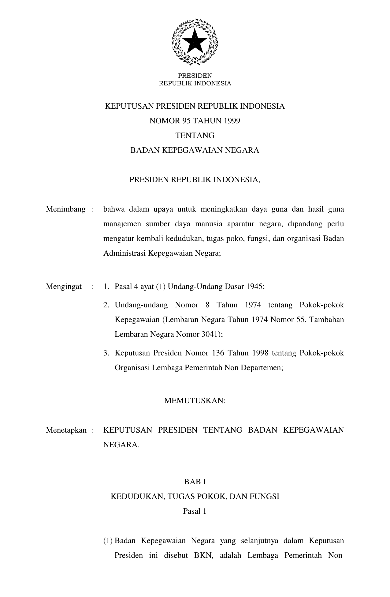 KEPPRES Nomor 95 Tahun 1999 | Keputusan Presiden Nomor 95 Tahun 1999 tentang BADAN KEPEGAWAIAN NEGARA