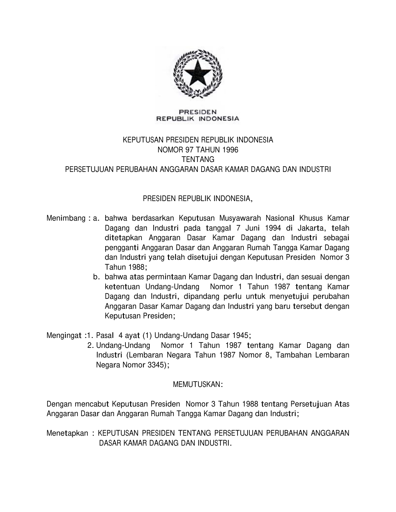 KEPPRES Nomor 97 Tahun 1996 | Keputusan Presiden Nomor 97 Tahun 1996 tentang PERSETUJUAN PERUBAHAN ANGGARAN DASAR KAMAR DAGANG DAN INDUSTRI