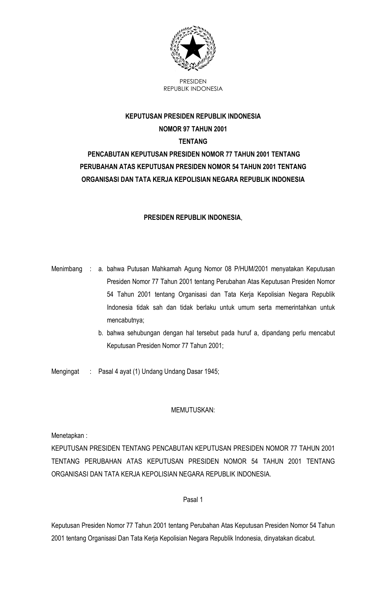 KEPPRES Nomor 97 Tahun 2001 | Keputusan Presiden Nomor 97 Tahun 2001 tentang PENCABUTAN KEPPRES 77-2001 TENTANG PERUBAHAN KEPPRES 54-2001 TENTANG ORGANISASI DAN TATA KERJA KEPOLISIAN NEGARA RI