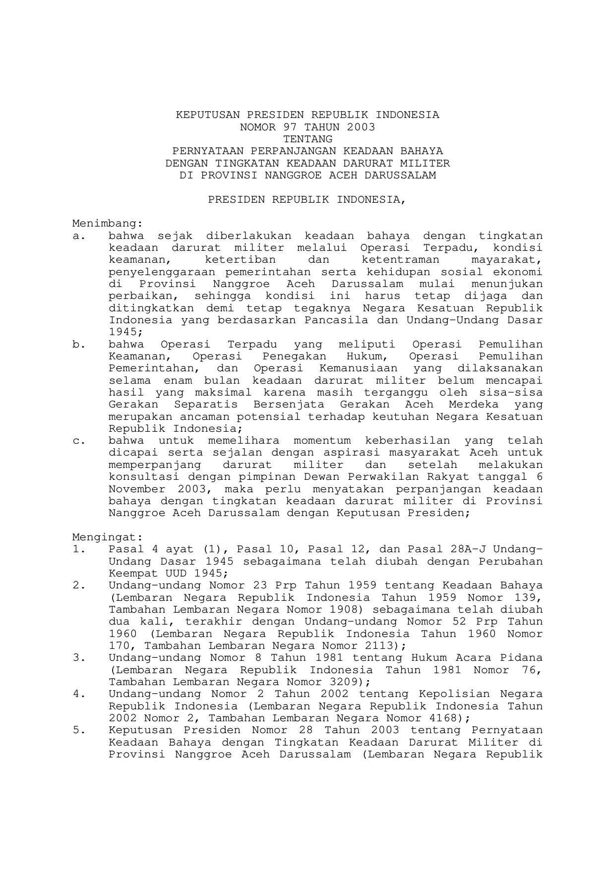 KEPPRES Nomor 97 Tahun 2003 | Keputusan Presiden Nomor 97 Tahun 2003 tentang PERNYATAAN PERPANJANGAN KEADAAN BAHAYA DENGAN TINGKATAN KEADAAN DARURAT MILITER DI PROVINSI NANGGROE ACEH DARUSSALAM