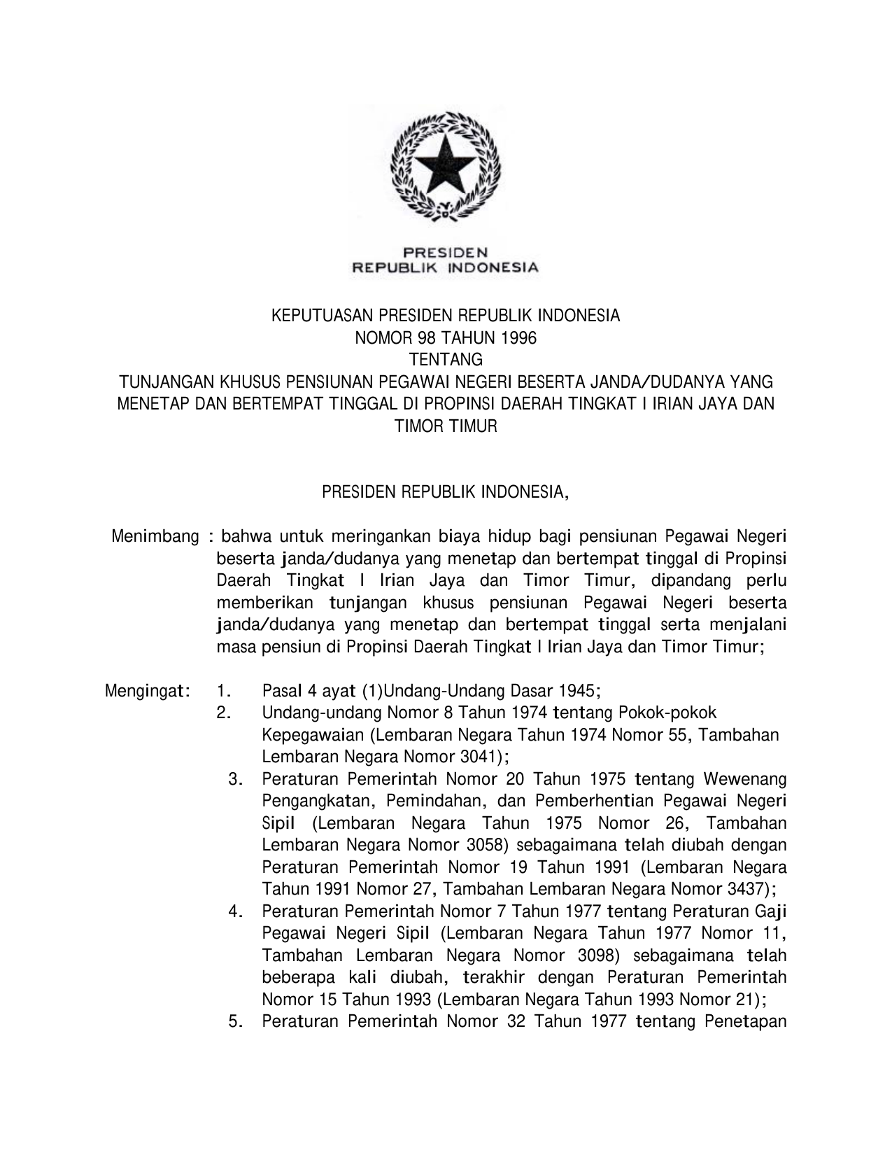 KEPPRES Nomor 98 Tahun 1996 | Keputusan Presiden Nomor 98 Tahun 1996 tentang TUNJANGAN KHUSUS PENSIUN PEGAWAI NEGERI PESERTA JANDA/DUDANYA YANG MENETAP DAN BERTEMPAT TINGGAL DI PROVINSI DAERAH TINGKAT I IRIAN JAYA DAN TIMOR TIMUR