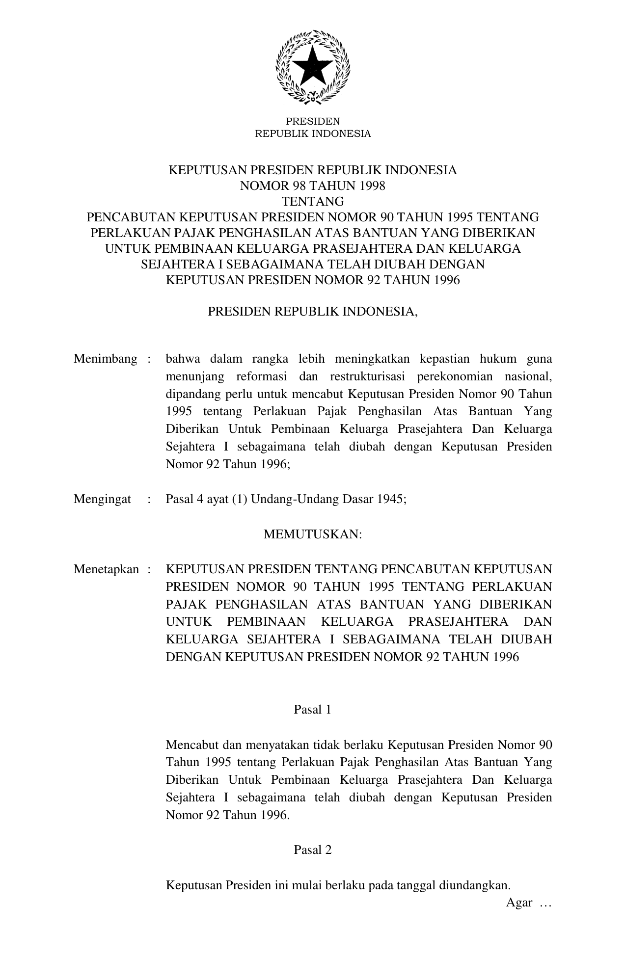 KEPPRES Nomor 98 Tahun 1998 | Keputusan Presiden Nomor 98 Tahun 1998 tentang PENCABUTAN KEPUTUSAN PRESIDEN NOMOR 90 TAHUN 1995 TENTANG PERLAKUAN PAJAK PENGHASILAN ATAS BANTUAN YANG DIBERIKAN UNTUK PEMBINAAN KELUARGA PRASEJAHTERA DAN KELUARGA SEJAHTERA I SEBAGAIMANA TELAH DIUBAH DENGAN KEPUTUSAN PRESIDEN NOMOR 92 TAHUN 1996