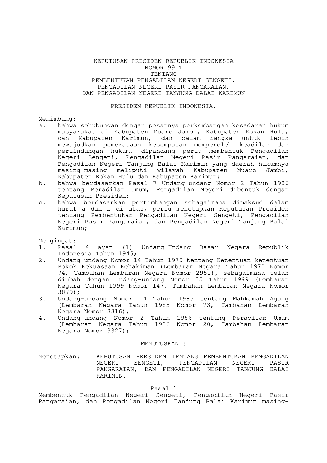 KEPPRES Nomor 99 Tahun 2003 | Keputusan Presiden Nomor 99 Tahun 2003 tentang PEMBENTUKAN PENGADILAN NEGERI SENGETI, PENGADILAN NEGERI PASIR PANGARAIAN, DAN PENGADILAN NEGERI TANJUNG BALAI KARIMUN