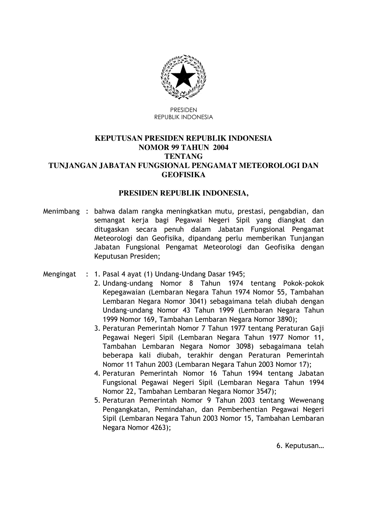 KEPPRES Nomor 99 Tahun 2004 | Keputusan Presiden Nomor 99 Tahun 2004 tentang TUNJANGAN JABATAN FUNGSIONAL PENGAMAT METEOROLOGI DAN GEOFISIKA