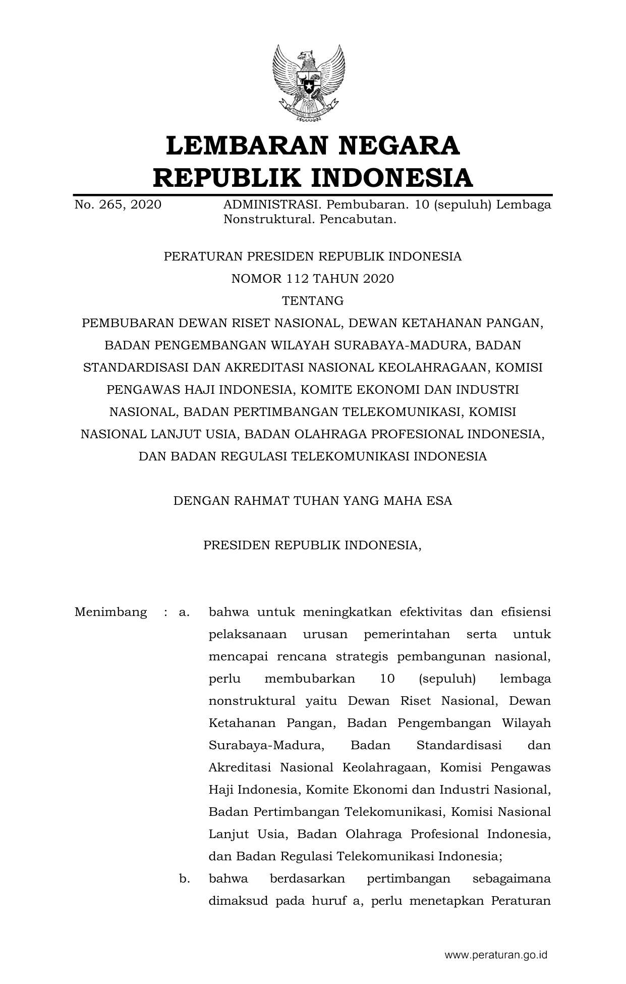 KEPPRES Nomor 112 Tahun 2020 | Keputusan Presiden Nomor 112 Tahun 2020 tentang PEMBUBARAN DEWAN RISET NASIONAL, DEWAN KETAHANAN PANGAN, BADAN PENGEMBANGAN WILAYAH SURABAYA-MADURA, BADAN STANDARDISASI DAN AKREDITASI NASIONAL KEOLAHRAGAAN, KOMISI PENGAWAS HAJI INDONESIA, KOMITE EKONOMI DAN INDUSTRI NASIONAL, BADAN PERTIMBANGAN TELEKOMUNIKASI, KOMISINASIONAL LANJUT USIA, BADAN OLAHRAGA PROFESIONAL INDONESIA, DAN BADAN REGULASI TELEKOMUNIKASI INDONESIA