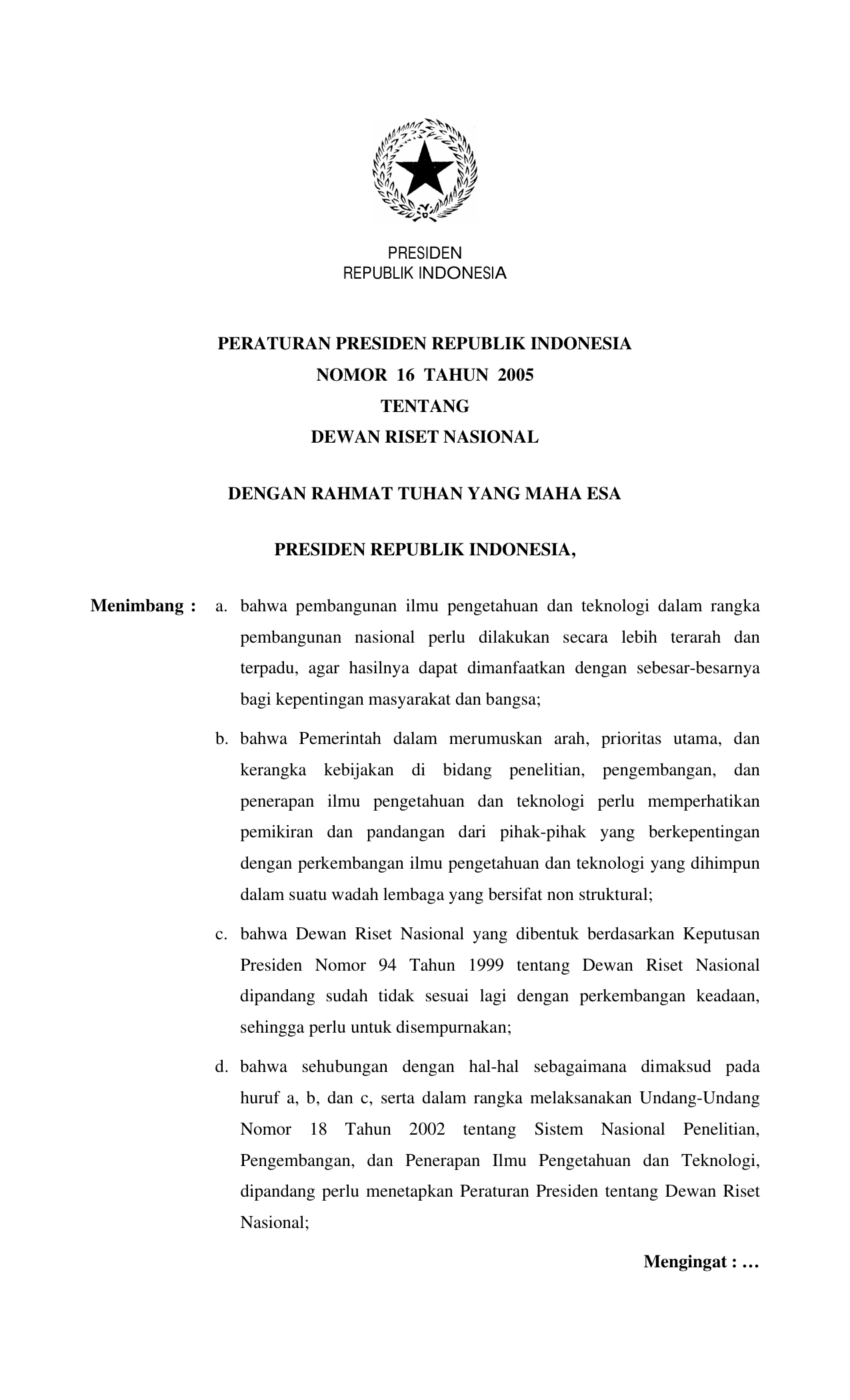 KEPPRES Nomor 16 Tahun 2005 | Keputusan Presiden Nomor 16 Tahun 2005 tentang DEWAN RISET NASIONAL