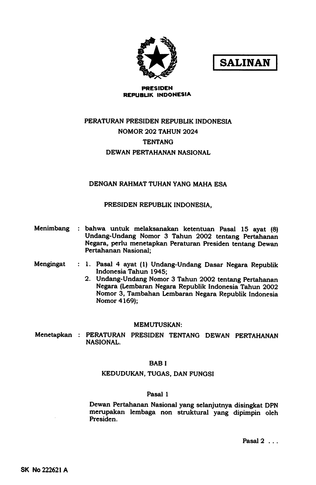 KEPPRES Nomor 202 Tahun 2024 | Keputusan Presiden Nomor 202 Tahun 2024 tentang DEWAN PERTAHANAN NASIONAL