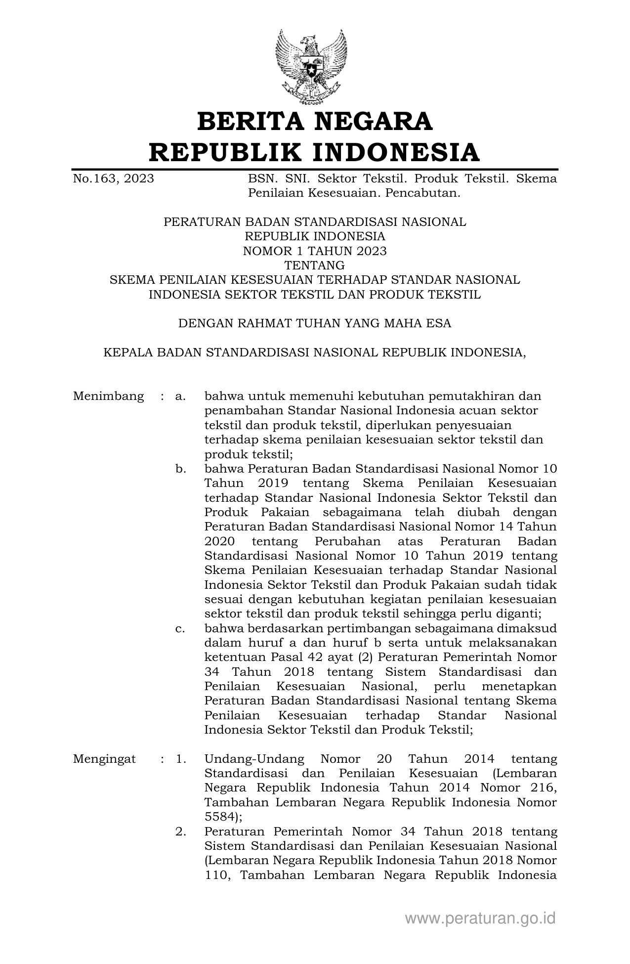 PERBAN Nomor 1 Tahun 2023 | Peraturan Badan Nomor 1 Tahun 2023 tentang SKEMA PENILAIAN KESESUAIAN TERHADAP STANDAR NASIONAL INDONESIA SEKTOR TEKSTIL DAN PRODUK TEKSTIL