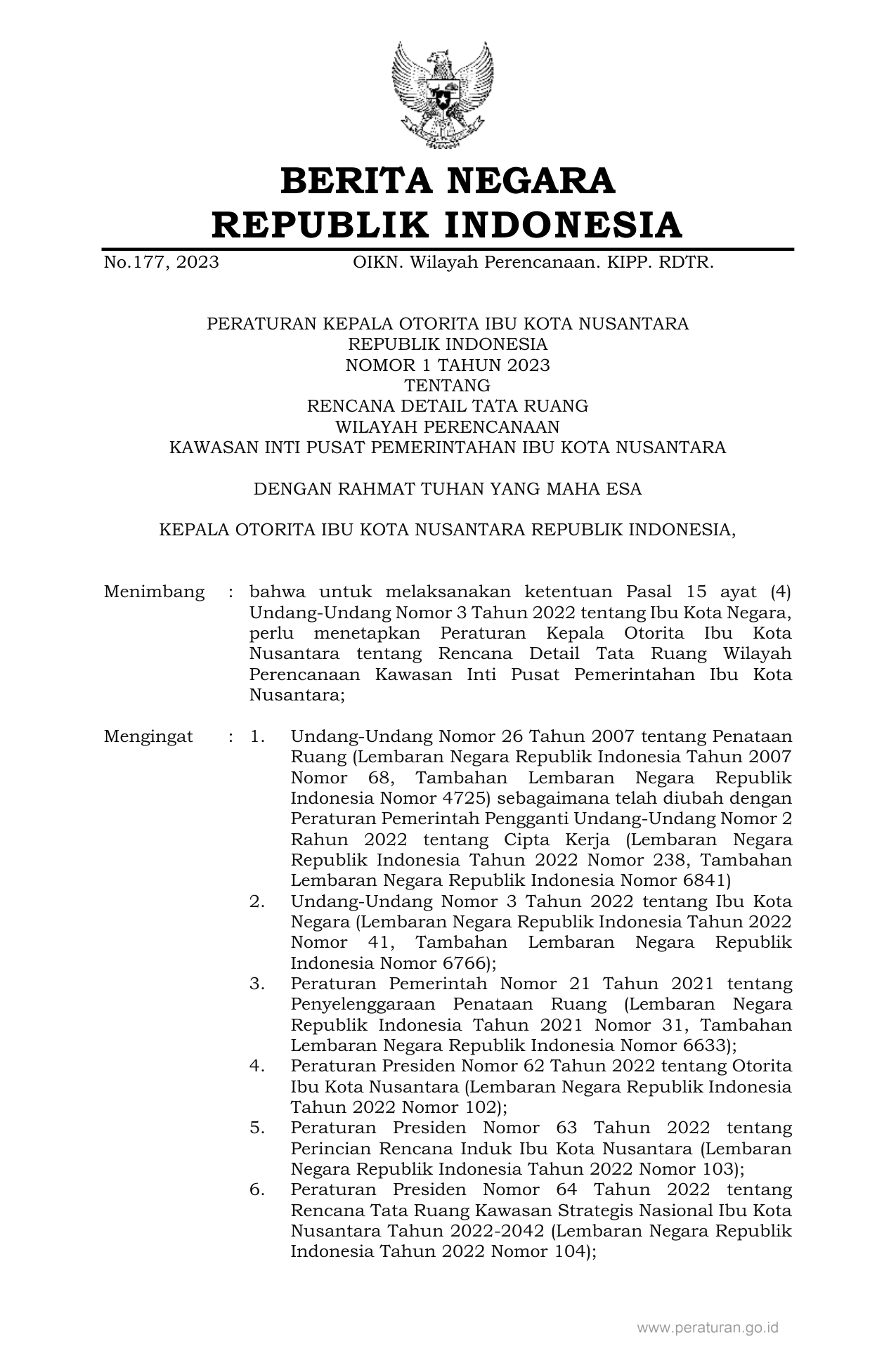 PERBAN Nomor 1 Tahun 2023 | Peraturan Badan Nomor 1 Tahun 2023 tentang RENCANA DETAIL TATA RUANG WILAYAH PERENCANAAN KAWASAN INTI PUSAT PEMERINTAHAN IBU KOTA NUSANTARA