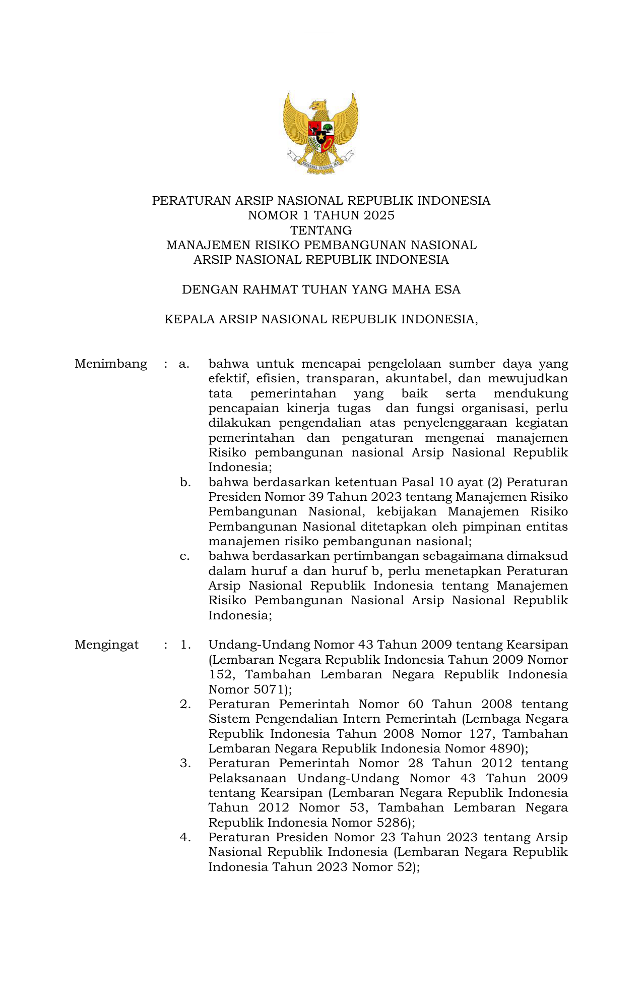 PERBAN Nomor 1 Tahun 2025 | Peraturan Badan Nomor 1 Tahun 2025 tentang Manajemen Risiko Pembangunan Nasional Arsip Nasional Republik Indonesia